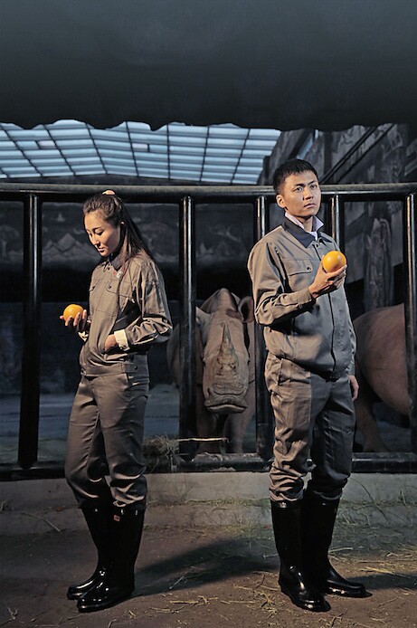 (海報(bào)攝制時(shí),兩頭白犀牛十分“給面子”。圖中:牢籠、犀牛、橙子、距離、都是本片的關(guān)鍵詞。)