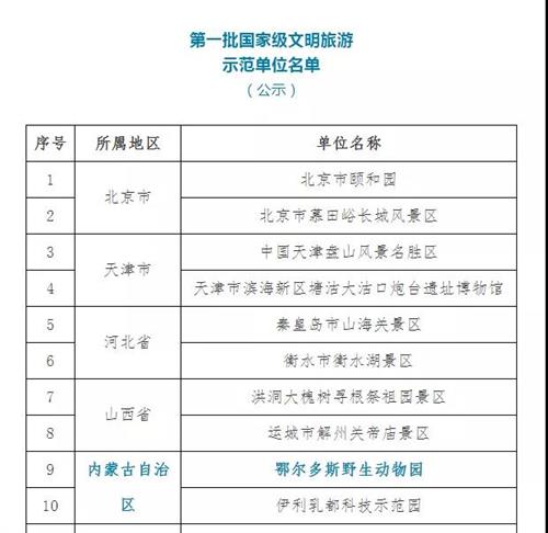 11月17日,全國旅游標準化技術(shù)委員會對第一批國家級文明旅游示范單位評定結(jié)果進行公示,國家4A級旅游景區(qū)鄂爾多斯野生動物園成功入圍。